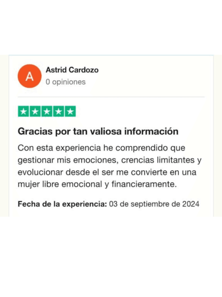 Más de 5 años de experiencia integrando principios financieros conscientes con una profunda conexión con el Ser, ofreciendo una solución integral respaldada científicamente. Abordamos de manera efectiva tanto el bienestar emocional como el éxito financiero, garantizando resultados tangibles desde la primera semana y adaptándose a la compleja realidad de las mujeres en Latinoamérica.